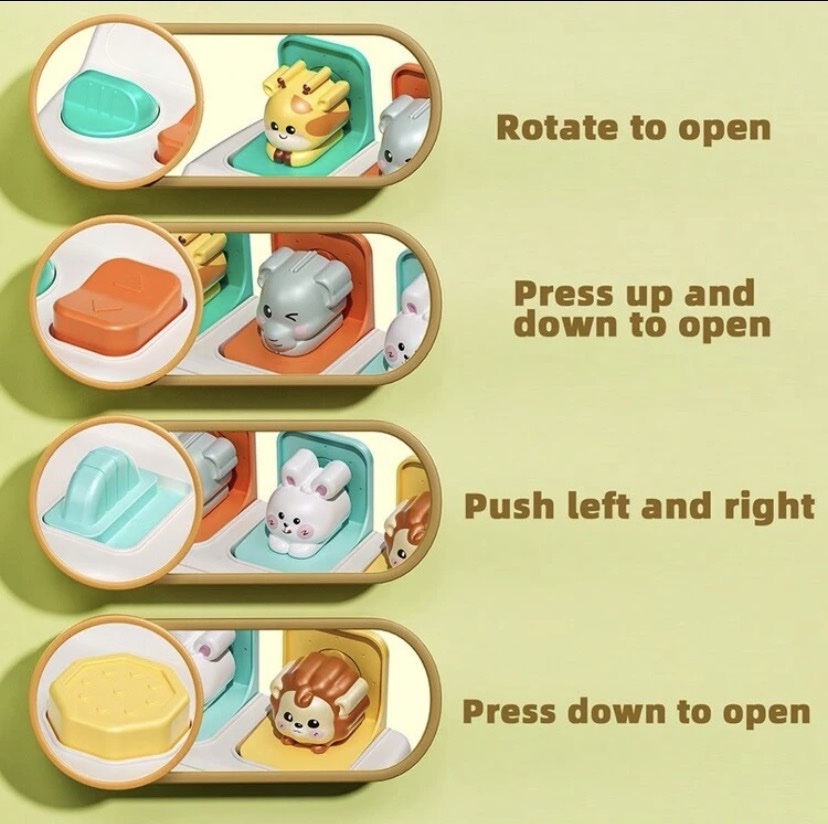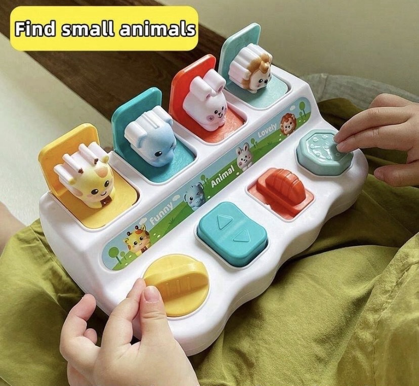لعبة الحيوانات التفاعلية للأطفال، لعبة ممتعة وتعليمية تحتوي على عدة شخصيات حيوانات لطيفة مثل الزرافة والأرنب والقطة والقنفذ. عند الضغط على الأزرار تفتح الأبواب ويظهر الحيوان، مما يجعل الطفل يستمتع بالمفاجأة واللعب.
